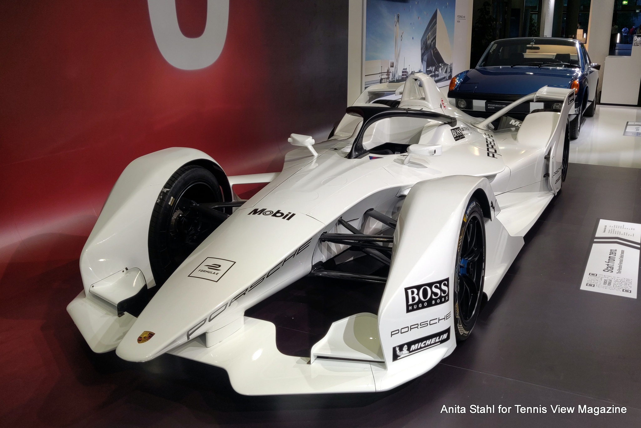 Electric powered Porsche race car for the Formula E circuit displayed in the lobby