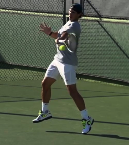 The following pictures will help clear up this myth. Let’s use the best of the best for our pictures. Professional players for the most part should be studied rather than interviewed for their understanding of the game, especially stroke mechanics. Just because a player excels at striking the ball does not mean they know how that strike took place. When learning how to hit a tennis ball, you are much better off listening to the Vic Bradens, Steve Smiths (Great Base Initiative) and Dr. Howard Brodys (Ph. D., Professor Emeritus of Physics, University of Pennsylvania, and Member of USTA Sport Science and Technical Committee) of the world rather than the players we envy who make shots we can only dream about. Granted, Rafael Nadal could beat Vic, Steve, and Howard 6-0 6-0 with a frying pan, but when taking a lesson you want the “teacher,” and the incredible wealth of information they bring to the game is second to none.